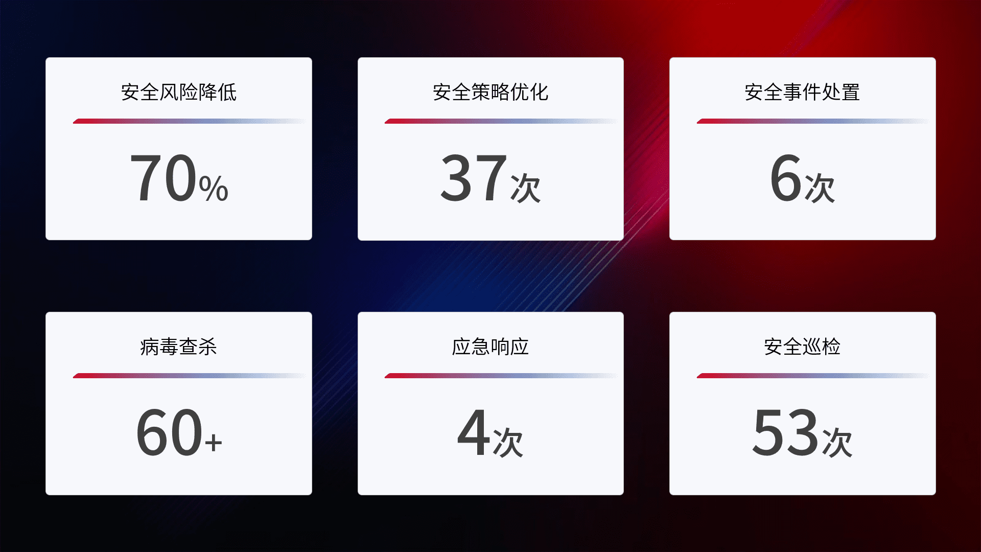 提供全面的安全事件报告体系,,,,包括处置报告、、、、周报、、、、季度和年度总结,,,,结合持续监控,,,,帮助客户深入了解网络安全状况。。。。
