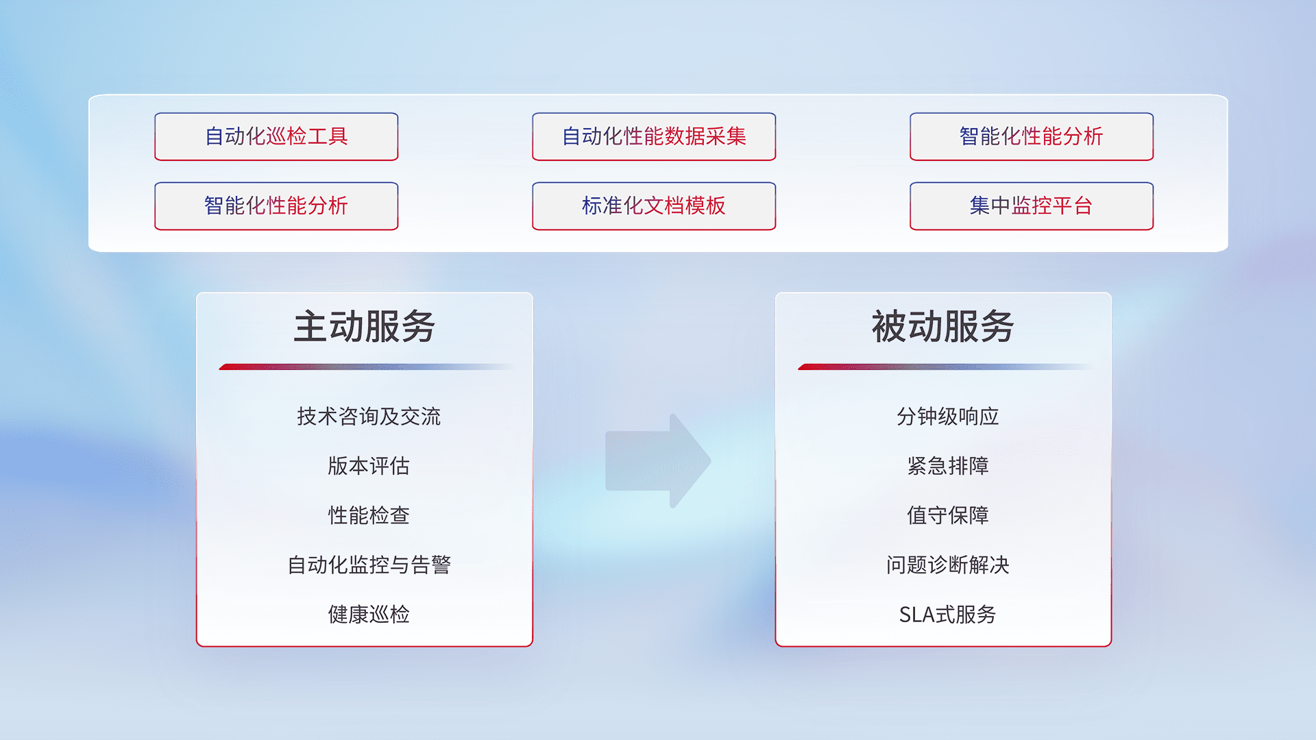 智能化工具和标准化文档,,,,保障服务质量,,,提供主动服务(包含技术咨询、、版本评估、、、性能检查、、自动化监控与告警、、、健康巡检)和被动服务包含(分钟级响应、、、、紧急排障、、、、值守保障、、问题诊断解决、、、、SLA服务)。。。