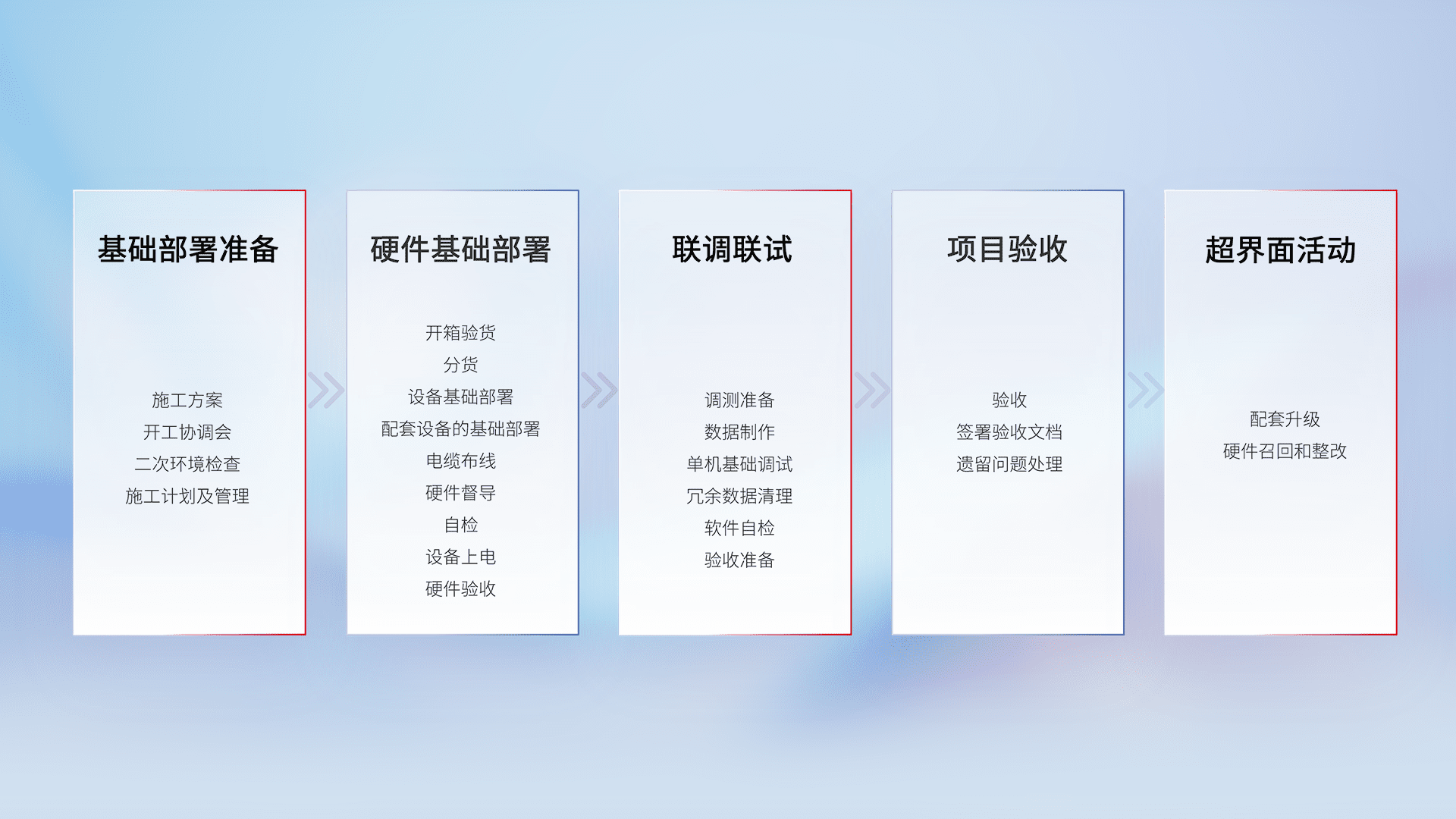 从基础部署准备、、、、硬件基础部署、、联调联试、、、、项目验收、、、、越界面活动的全过程可追溯,,保证施工质量和进度。。。
